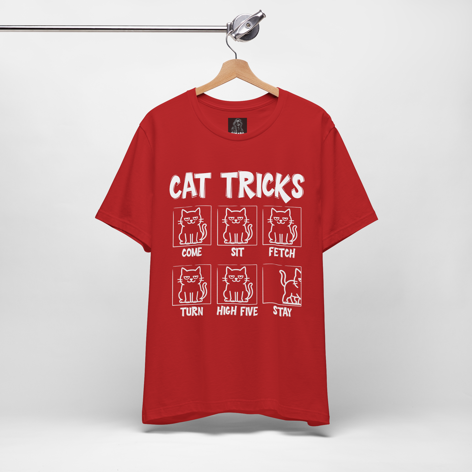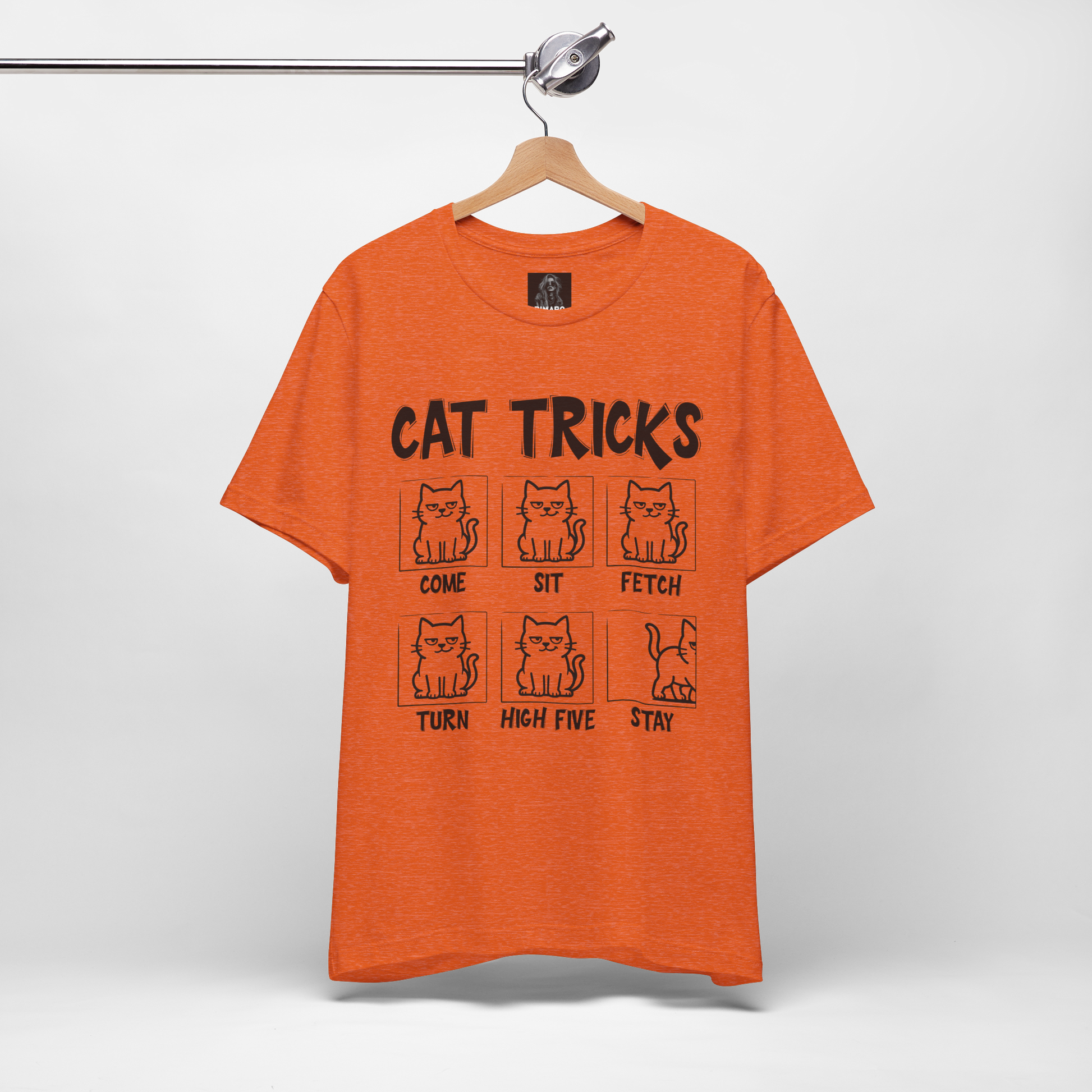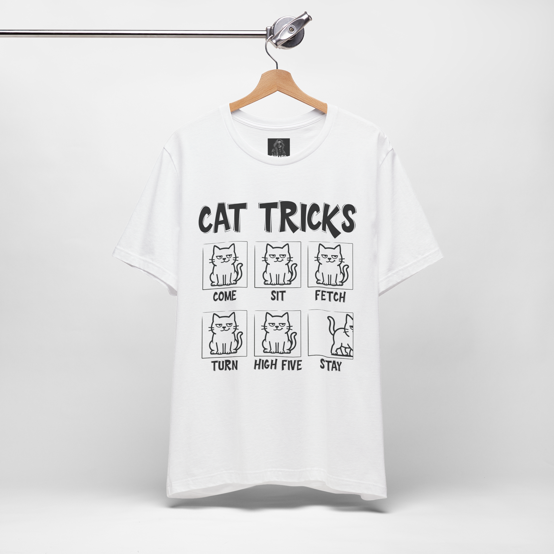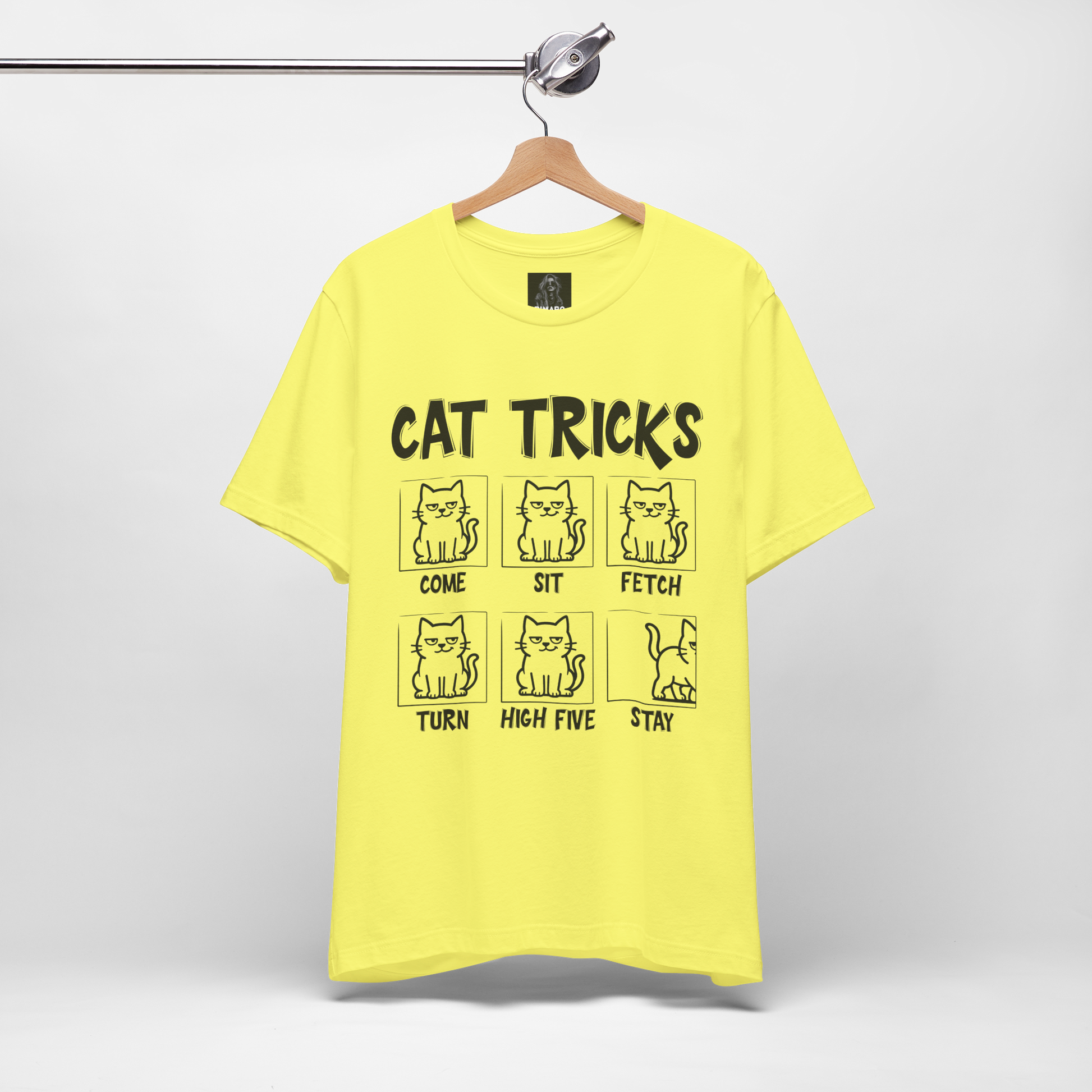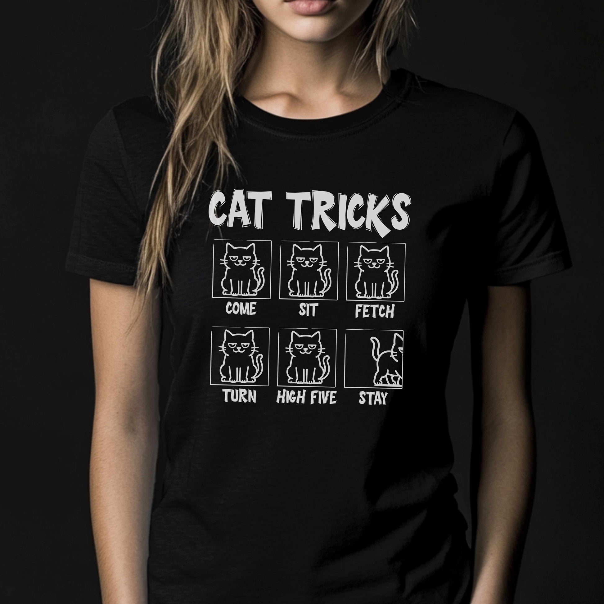 Unisex Funny Cat Tricks Shirt - Lazy Cat Graphic Tee come, sit, fetch, turn, high five, stay